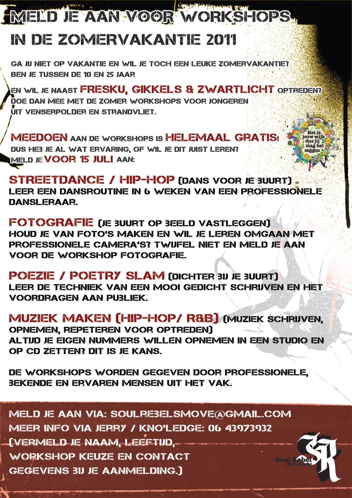 Stichting Soul Rebel Movement heeft in mei een aanvraag ingediend voor een project in Venserpolder (Amsterdam Zuidoost) en deze is goedgekeurd. We gaan verschillende workshops organiseren voor de jeugd in juli en augustus. De workshops bestaan uit: muziek, dans, poëzie en fotografie. De workshops worden verzorgd door Kno’Ledge Cesare & gastdocenten (poëzie) Smooky (dans), Gita Jagessar (fotografie), Nemesis, J. Sparx en Dj Skilla (muziek). Het is de bedoeling dat de jongeren die niet op vakantie gaan iets om de handen hebben. Na elke zomervakantie vertellen kinderen en jongeren op school en in de buurt over hoe leuk het wel niet was in Spanje, op de camping en het mooie zomerweer hier ver vandaan. De thuisblijvers hebben vaak niet veel spannends te melden. Vandaar dat wij hen dit jaar ook een mooie en gezellige zomervakantie willen bezorgen.